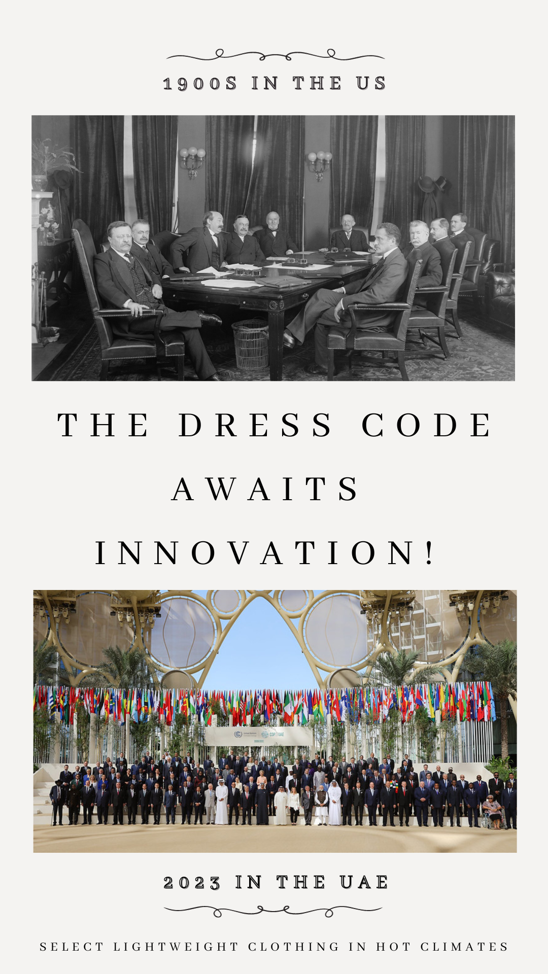 The fashion industry has taken on significant responsibilities to reduce CO2 emissions in its production and logistics processes. However, they should tackle another challenge as business fashion trends often revolve around traditional codes, lacking a universally grounded summer business dress code. Conventional business attire in tropical countries should be considered urgently and innovation is needed in this industry.
